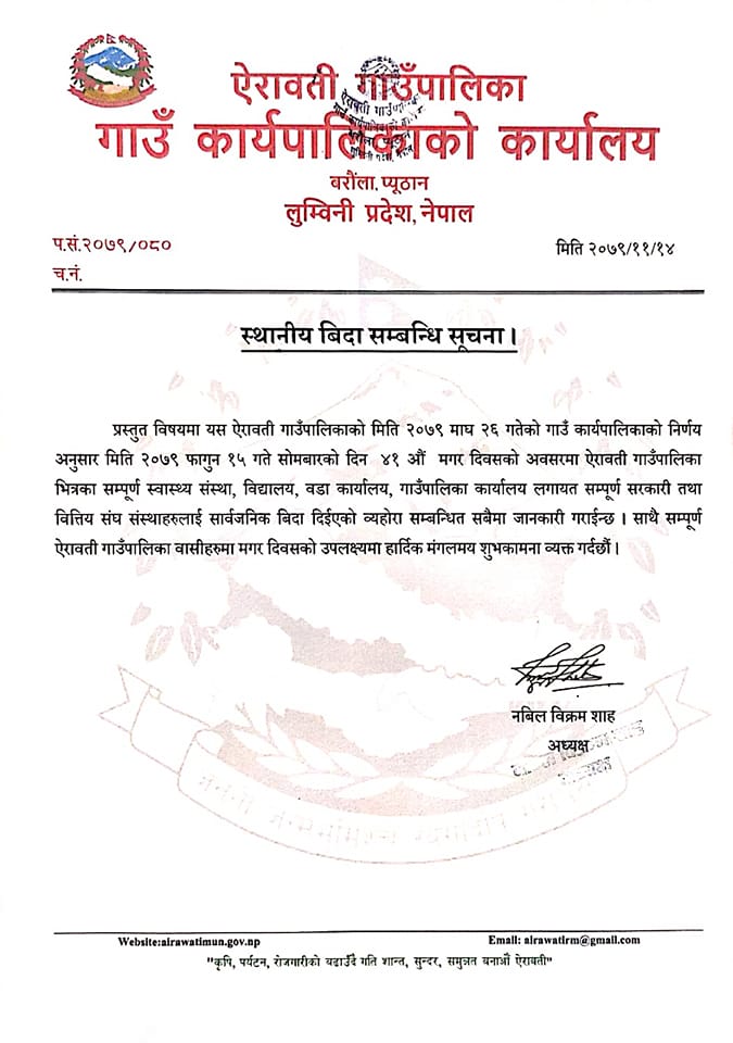 ऐरावतीले दियो मगर दिवसमा सार्वजनिक विदा