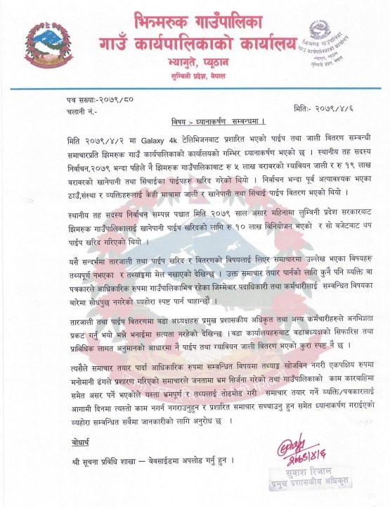 झिमरुक गाउँपालिकाले भन्यो ‘पाइप र तारजालीमा अनियमितता